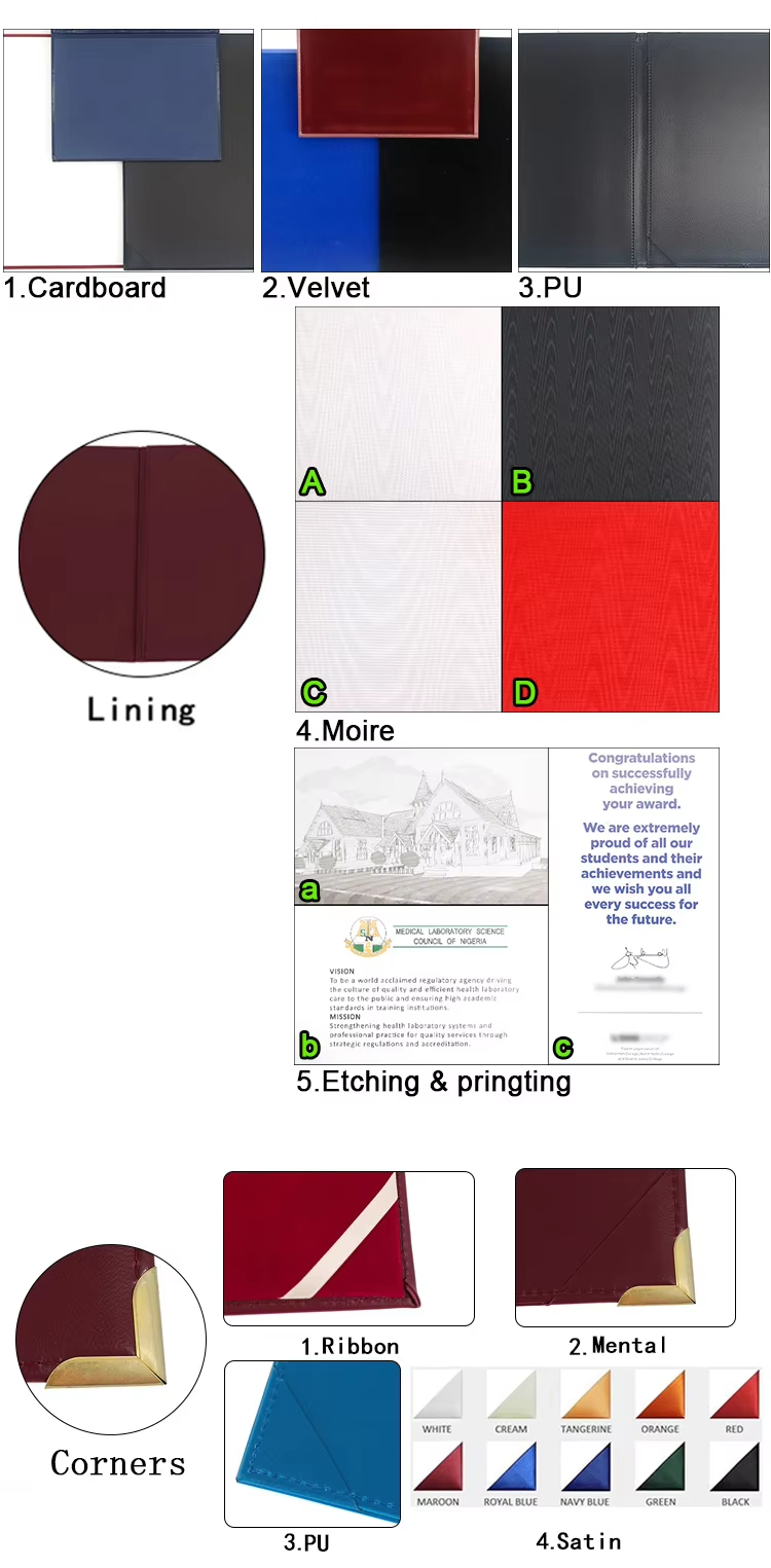 ● Αξία μάρκετινγκ:Ένας καλά σχεδιασμένος κάτοχος πιστοποιητικού μπορεί να βελτιώσει την ορατότητα της μάρκας σας προσθέτοντας το λογότυπο και τα εταιρικά σας χρώματα απευθείας στο εξώφυλλο. Όταν χρησιμοποιείται σε εκδηλώσεις ή για βραβεία υπαλλήλων, δημιουργεί μια επαγγελματική εντύπωση και διατηρεί το εμπορικό σήμα σας μπροστά από τον παραλήπτη για χρόνια. Αυτή η μικρή λεπτομέρεια ενισχύει την εικόνα της εταιρείας σας κάθε φορά που εμφανίζεται το πιστοποιητικό.